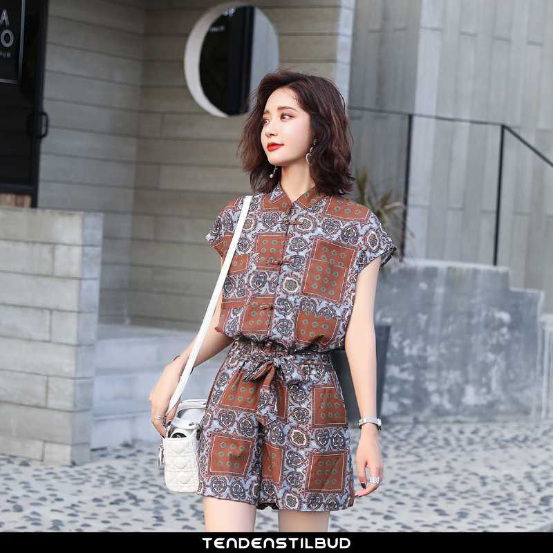 Bukser dame : shorts vintage tryk sommer 2020 brun alt matcher midt talje, farve : brune, blå.