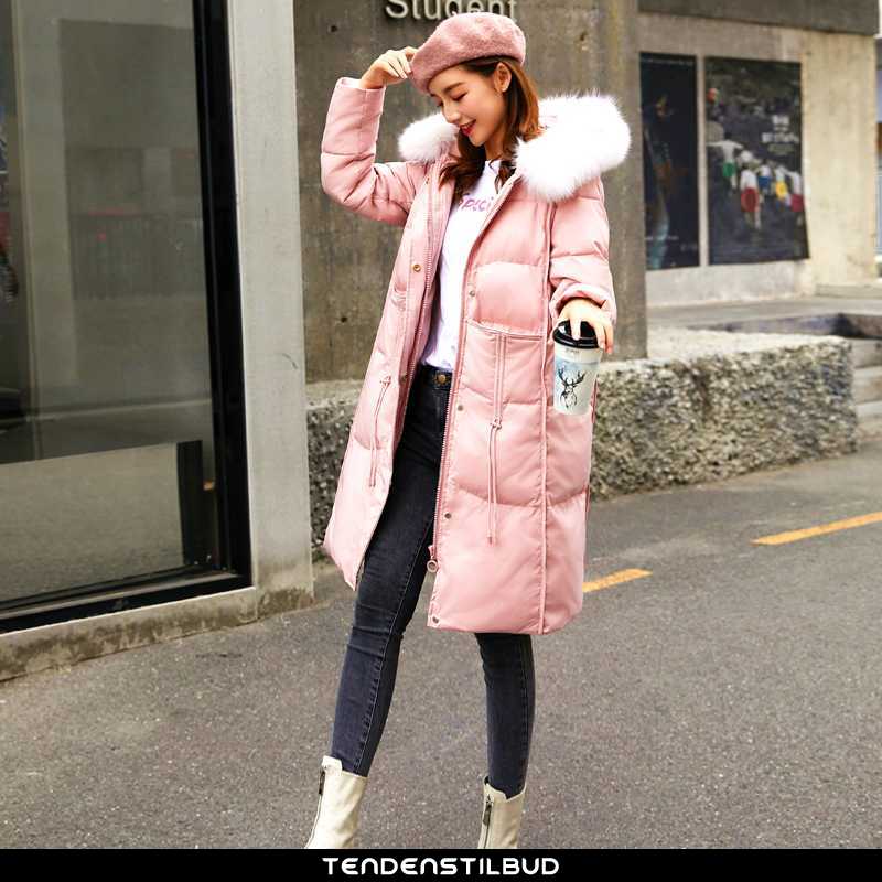 Dunjakke dame : frakke tykke trend vinter lang 2021 kvinde pelskrave lyserød dun ny hvid stor midten kvinder, farve : sort, lyserød, hvid.