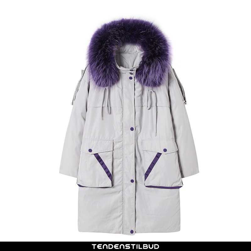Dunjakke dame : varm casual løse mode trend ren lommer lilla stor, farve : mørkeblå, lilla.