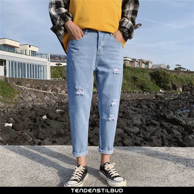 Jeans herre : cowboybukser bukser skinny slim fit med huller trend tynd sommer blå alt matcher, farve : mørkeblå.