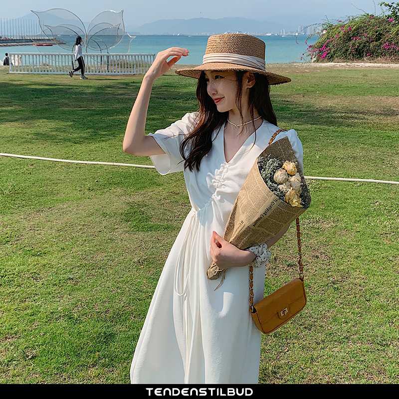 Kjoler dame : kjole højtaljet kortærmet slim fit lang forårs rejse boble hvid elegante ærme midten kvinder, farve : ren hvid.