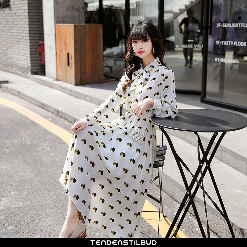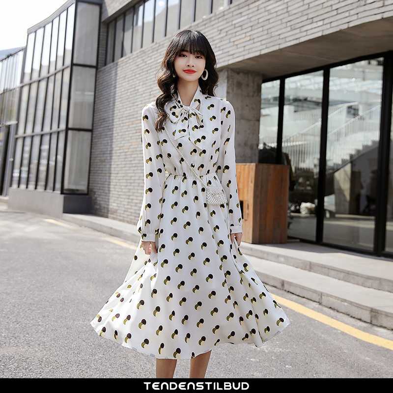 Kjoler dame : kjole højtaljet vintage elegante lang forårs sommer 2020 leggings hvid bølge punkt midten kvinder, farve : hvid.