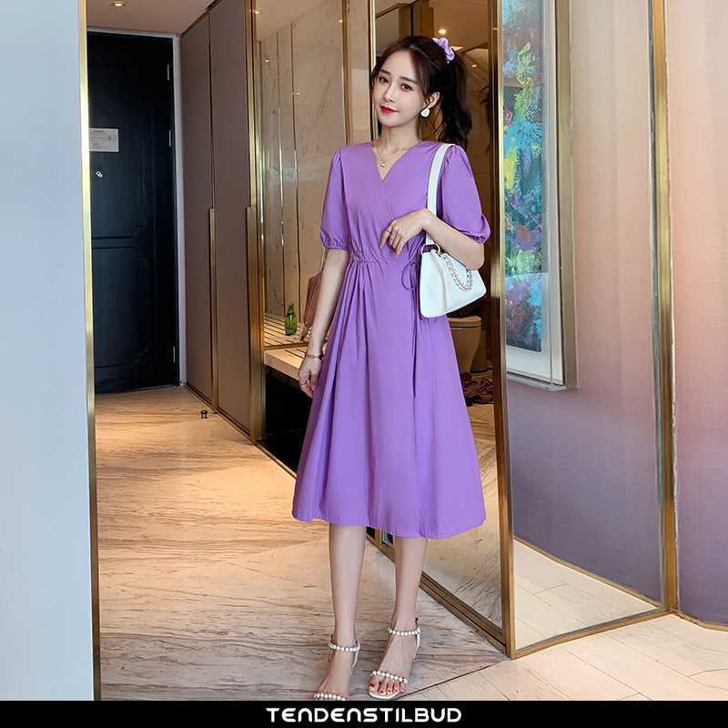 Kjoler dame : kjole vintage lang forårs 2020 boble elegante stramme ny lilla ærme kvinder, farve : lilla.