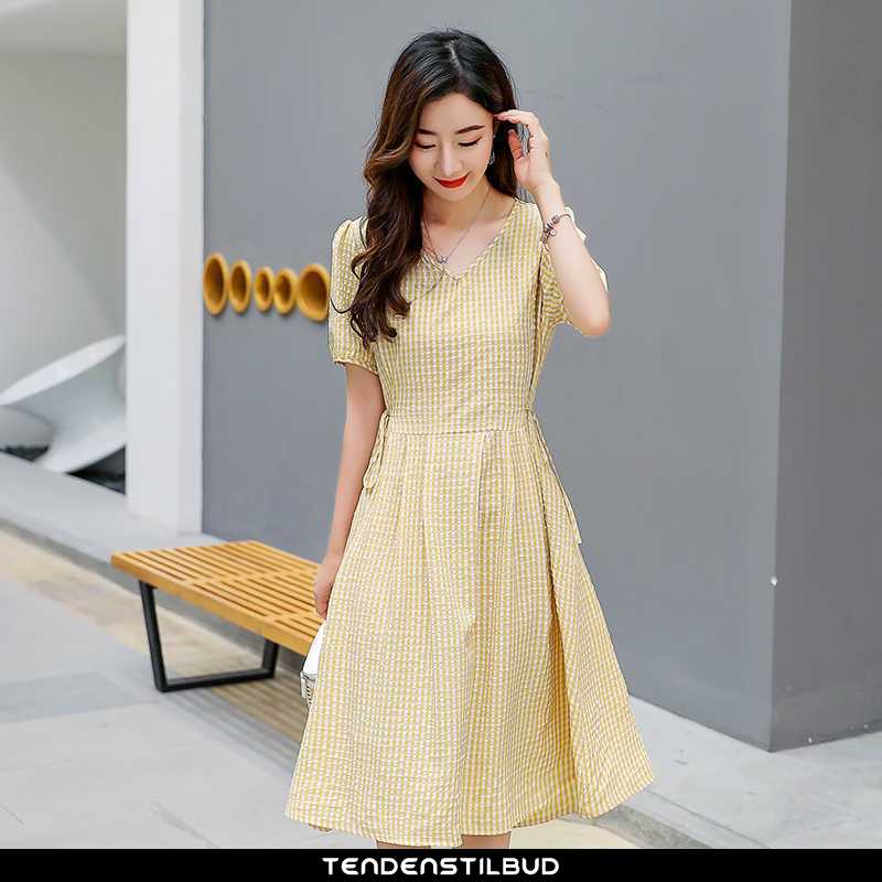 Kjoler dame : kjole bindebånd lang sommer 2020 ternede ny midten gul, farve : gul, sort.