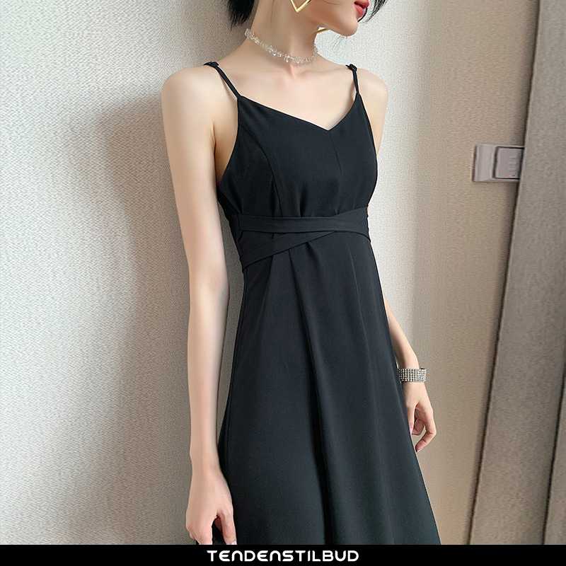 Kjoler dame : kjole skinny slim fit lang sommer med seler bælte stor midten kvinder sort, farve : sort.