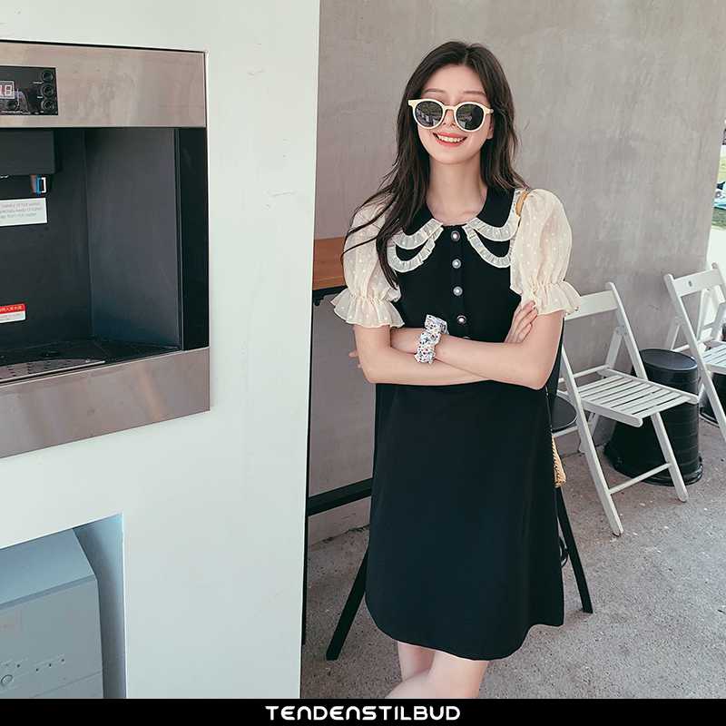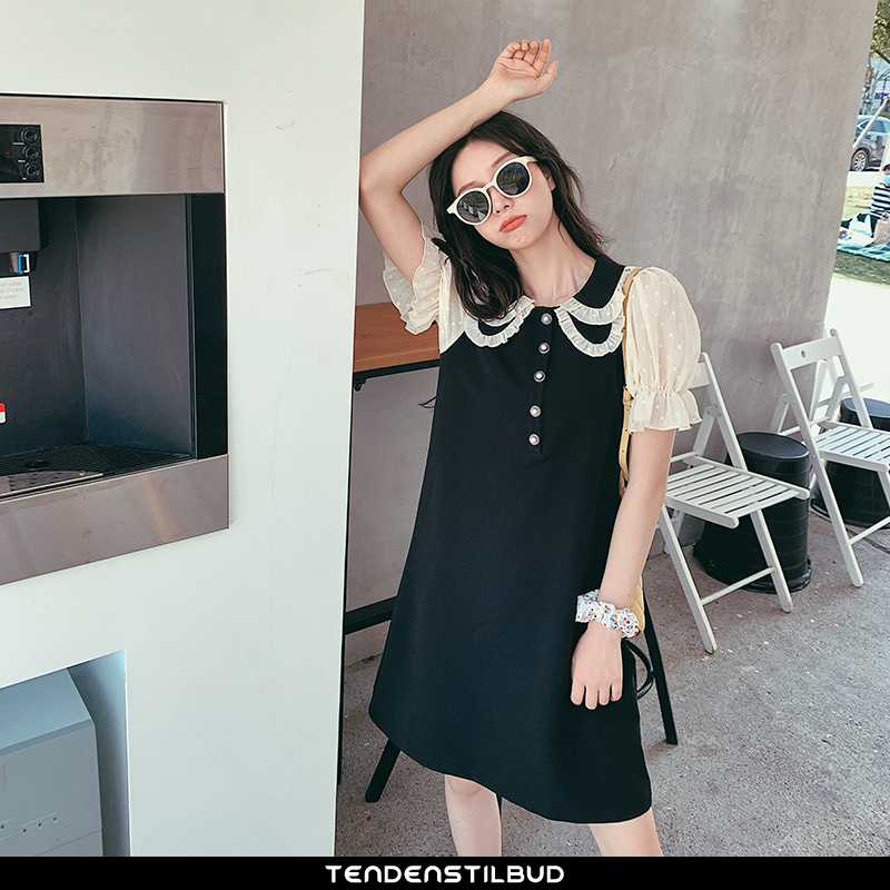 Kjoler dame : kjole kortærmet lang sommer 2020 ren hver dag rund hals midt talje midten sort, farve : sort.