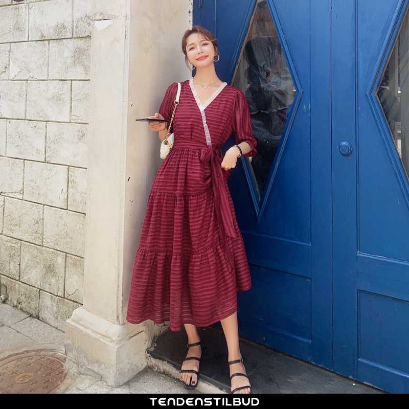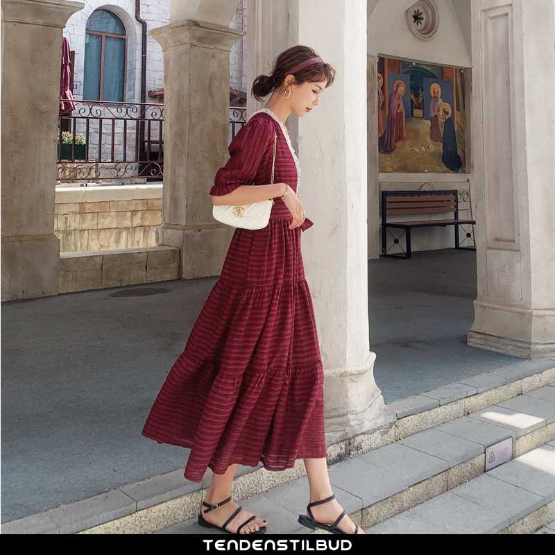 Kjoler dame : kjole vintage skinny lang sommer 2020 boble elegante ny ærme kvinder rød, farve : bordeaux.