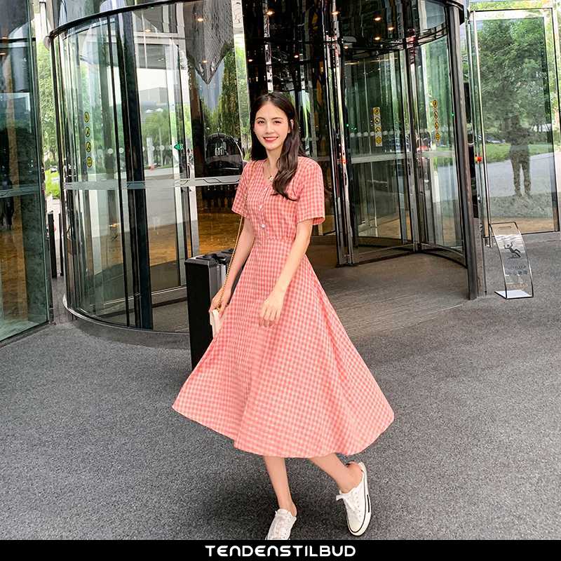 Kjoler dame : kjole vintage kortærmet skinny lang sommer bælte ternede stramme lyserød sød super kvinder, farve : lyserød rød.