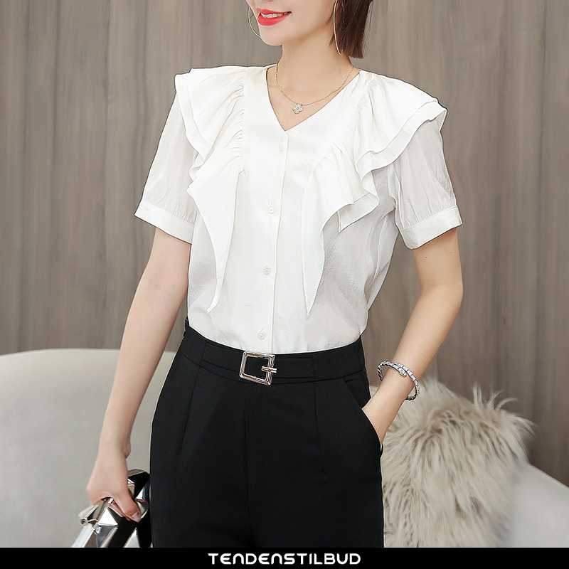 Skjorte dame : chiffon casual behagelige kortærmet v hals sommer 2020 plisseret lyserød ny, farve : ren hvid, lyserød rød, turkis, gul, mørkeblå.