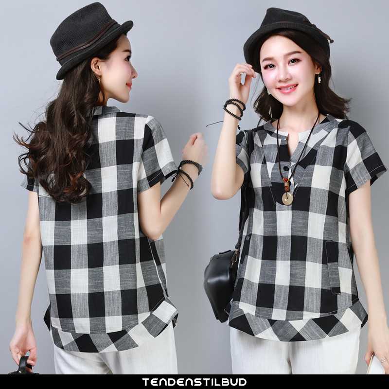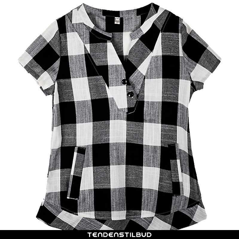 Skjorter dame : bluser skjorter bomuld løse mode skinny ternede store størrelser stor kvinder sort, farve : sort.