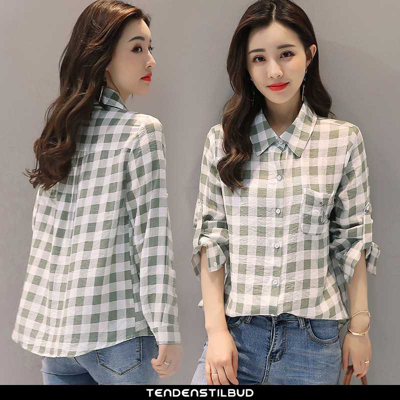 Skjorter dame : bluser skjorter casual forårs 2020 simple blå ternede kunst alt matcher ny, farve : blå, grøn.