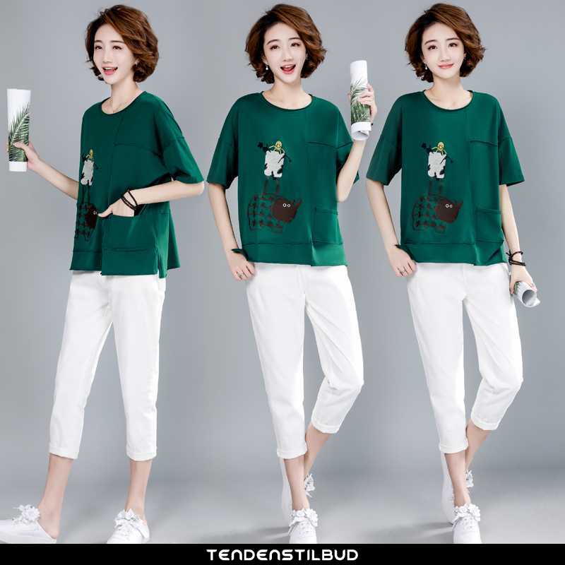 T-shirts dame : broderi løse kortærmet sommer 2021 brun rund hals pullover ny cartoon, farve : turkis, brune.