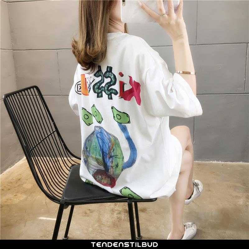 T-shirts dame : løse kortærmet lang jakke hvid blomsternet midten rød, farve : ren hvid, sort.