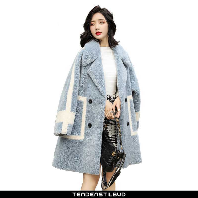 Uldfrakke dame : frakke mode behagelige langærmet uld elegante trend vinter lang 2021 blå midten, farve : blå.