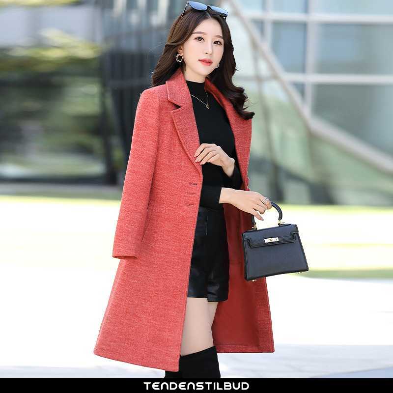 Uldfrakke dame : frakke mode behagelige langærmet uld trend vinter lang 2021 elegante midten, farve : beige, rød, grøn.
