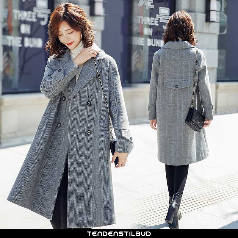 Uldfrakke dame : frakke varm mode langærmet uld slim fit vinter lang 2020 med knapper lommer khaki alt matcher midten, farve : grå, khaki.