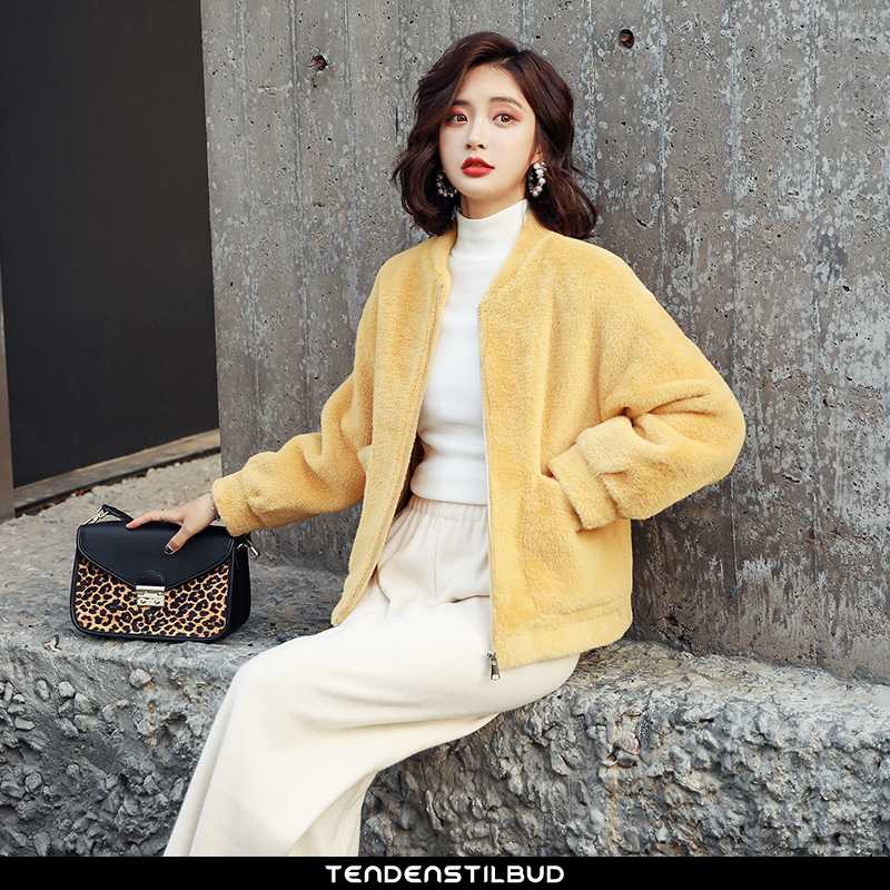 Uldfrakke dame : frakke ungdom casual mode vinter korte ren simple hvid elegante alt matcher guld, farve : lyserød rød, gul, hvid beige.