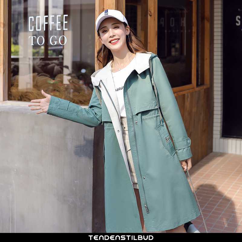 Vindjakke dame : frakke trenchcoat casual løse mode med hætte lang 2021 mørkeblå ny midten, farve : mørkeblå, turkis.