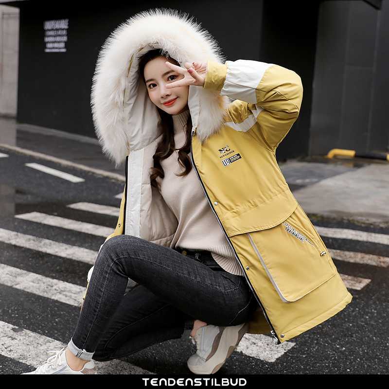 Vinterjakke dame : bomuld jakke bomuldsjakke mode elegante vinter 2021 stramme splejsning alt matcher gul, farve : gul, hvid beige, sort.