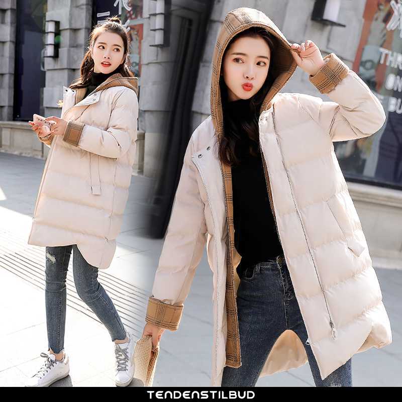 Vinterjakke dame : bomuld jakke varm straight behagelige med hætte langærmet slim fit vinter lang 2020 ren lommer blå midten, farve : beige, sort, mørkeblå.