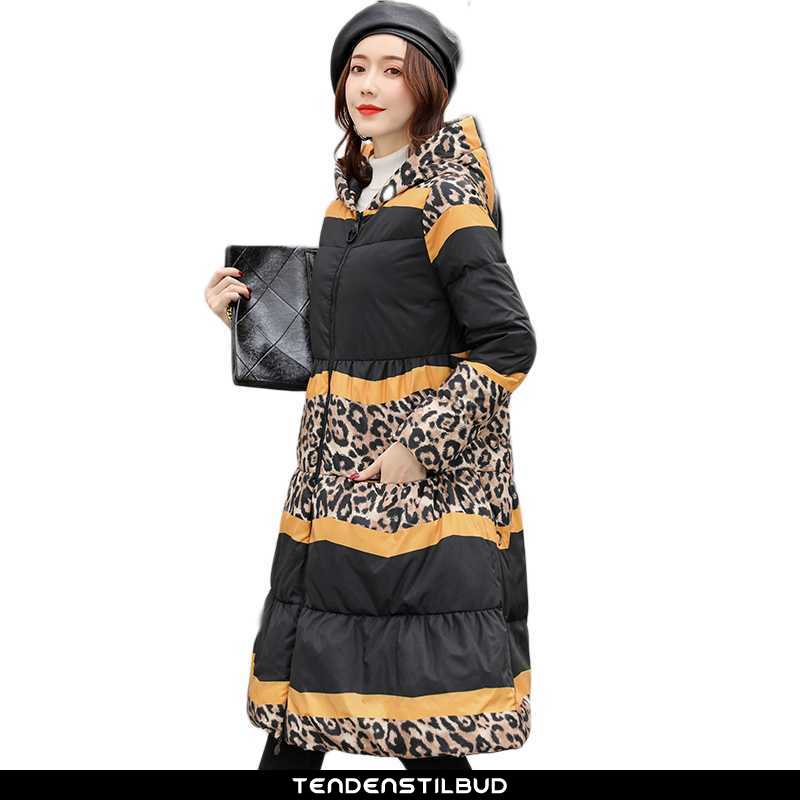 Vinterjakke dame : bomuldsjakke dun bomuld med hætte langærmet tykke leopard slim fit vinter lang 2021 ny sort, farve : sort.