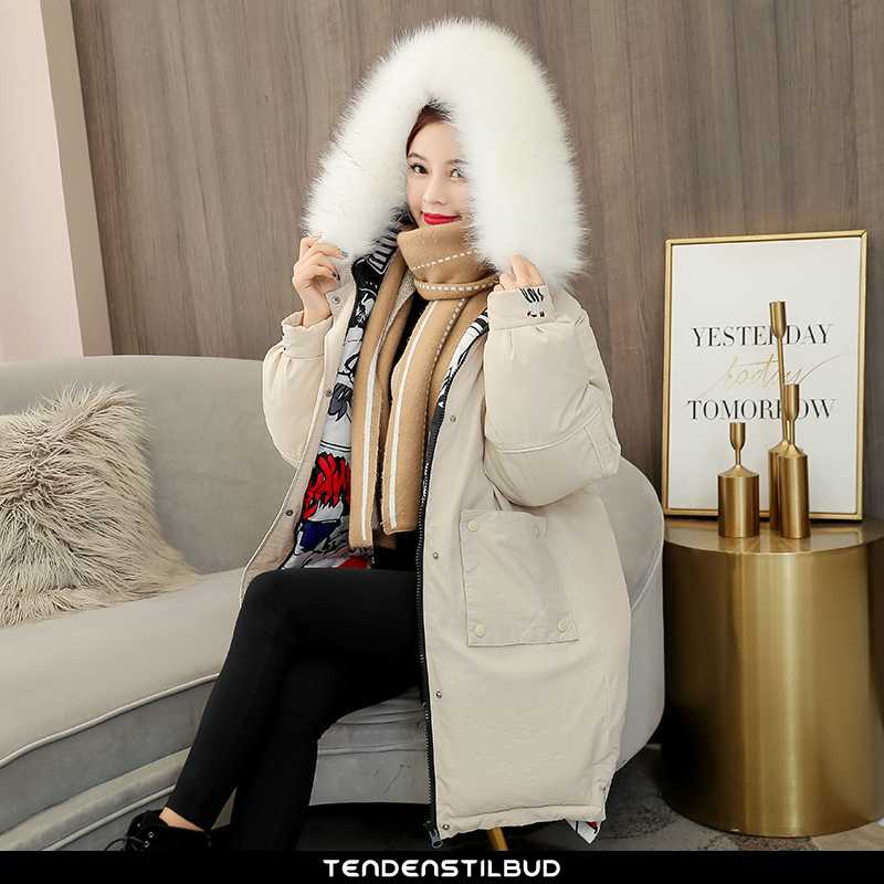 Vinterjakke dame : frakke dun bomuld broderi vendbar pelskrave hvid stor traner, farve : beige, sort.