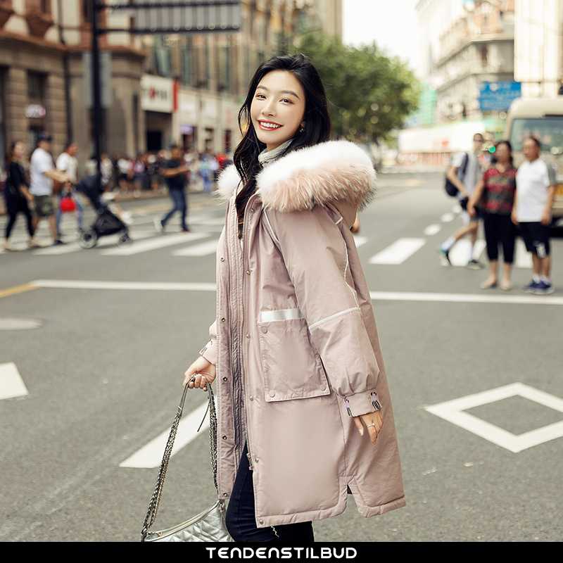 Vinterjakke dame : bomuld jakke frakke bomuldsjakke løse mode med hætte broderi tykke trend vinter lang 2021 pelskrave lyserød stor midten kvinder, farve : khaki, lyserød, sort.